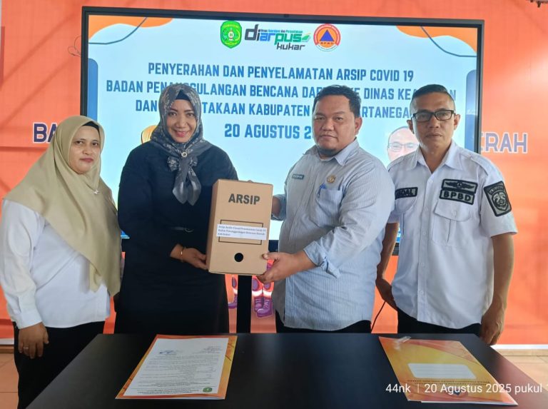 PORTALBORNEO.ID, Kutai Kartanegara – Badan Penanggulangan Bencana Daerah (BPBD) Kabupaten Kutai Kartanegara secara resmi menyerahkan arsip penanganan Covid-19 kepada Dinas Kearsipan dan Perpustakaan Kukar pada Rabu, 20 Agustus 2025. Penyerahan ini menandai langkah penting dalam menjaga memori kolektif daerah tentang pandemi yang sempat melumpuhkan aktivitas masyarakat pada 2020–2022.